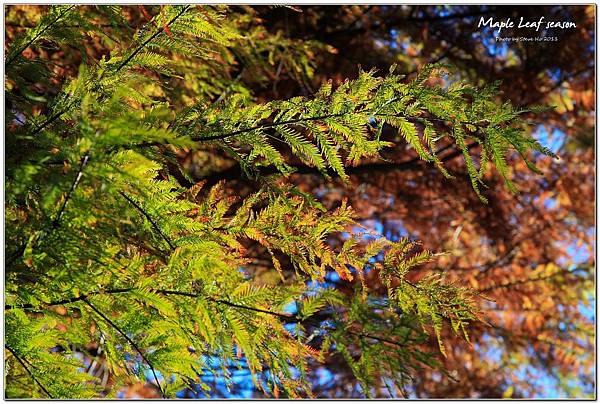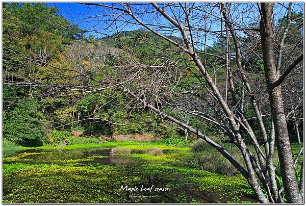 ▲ 奧萬大的生態池,池面佈滿了綠色的浮萍,搭配池邊的楓樹與遠山藍天,令人心曠神怡。