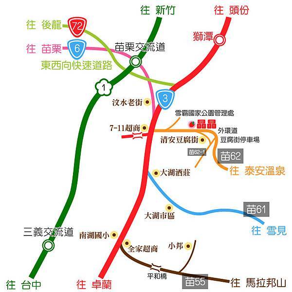 走國道一號中山高→在132公里苗栗交流道下,南下右轉北上左轉往苗栗方向→接台72線東西向快速道路抵達汶水→右轉接台三線→在台三線127.5公里7~11 超商正前方苗62線(往泰安溫泉方向)→晶晶草莓園位於苗62線600公尺處左側→現場備有採草莓專用停車場。