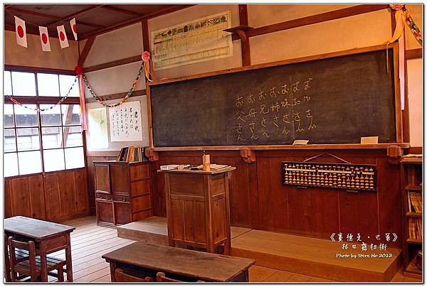 32.公學校的設計也是非常地真實,天花板上掛著日本國旗,教室內的課桌椅都是重新打造。黑板還寫著爸爸、媽媽、哥哥、姊姊的日文