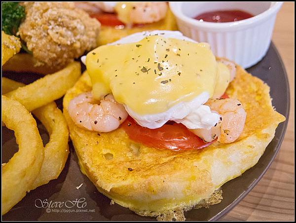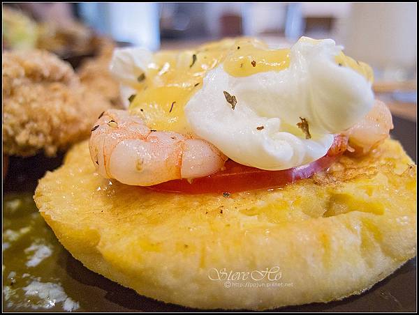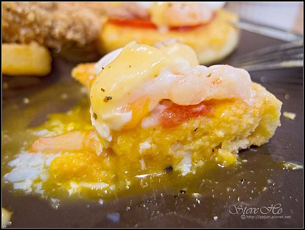 ▼ 從上而下分別是起司醬、水波蛋,鮮蝦+蕃茄,最下面是滿福堡包,而且是有沾過蛋液去煎的那種
