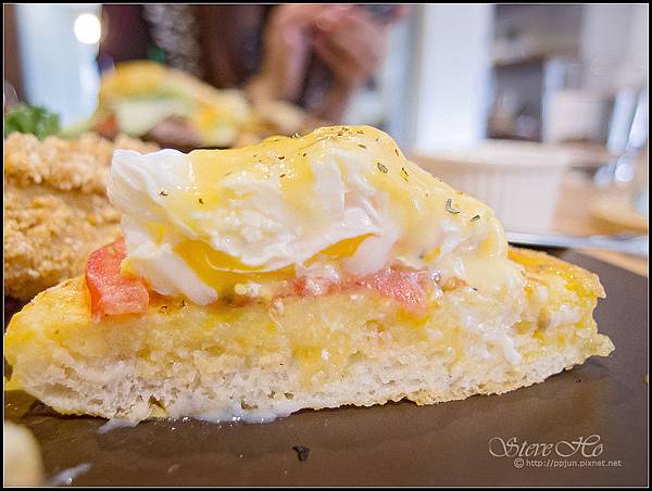 ▼ 切開後可以看到水波蛋的蛋液緩緩流出,與最下面的滿福堡包融合在一起