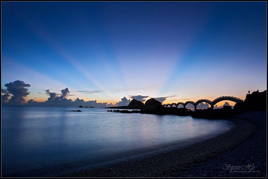 ▼ 雲彩配上造型獨特優美的八拱橋剪影,宛如一條巨龍伏臥海上,很有氣勢