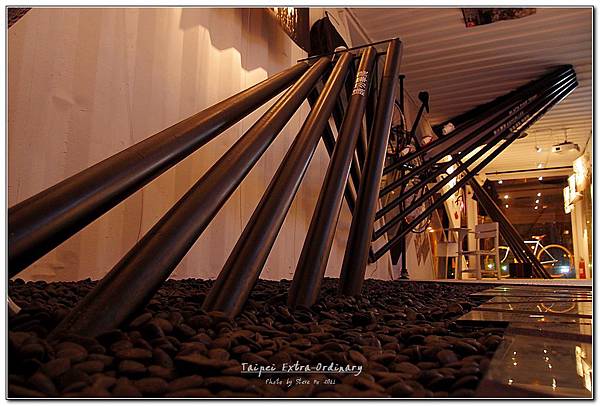 利用通透貨櫃的狹長空間、結合車道設計與櫥窗展示,整體以流暢連續的鋼管串連構成,象徵都市時間的流動韻律感。