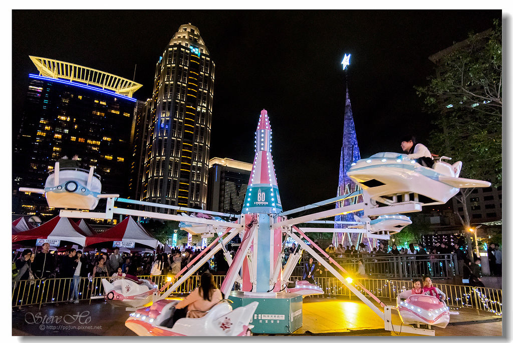 ▲ 站在廣場中央面對聖誕樹,左邊有「童話旋轉木馬」,右邊為「冒險小飛機」