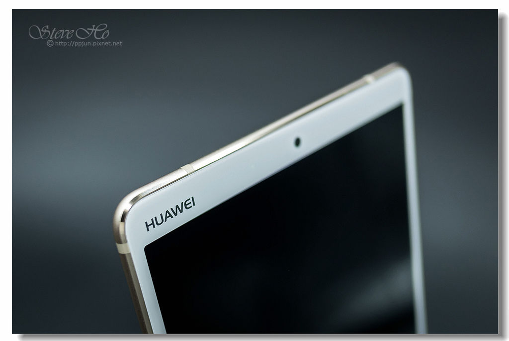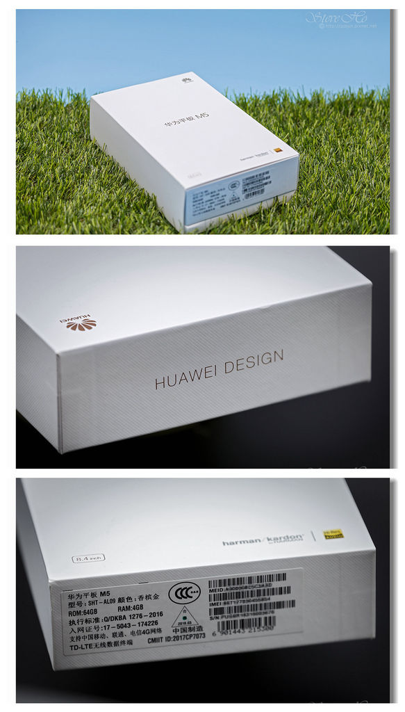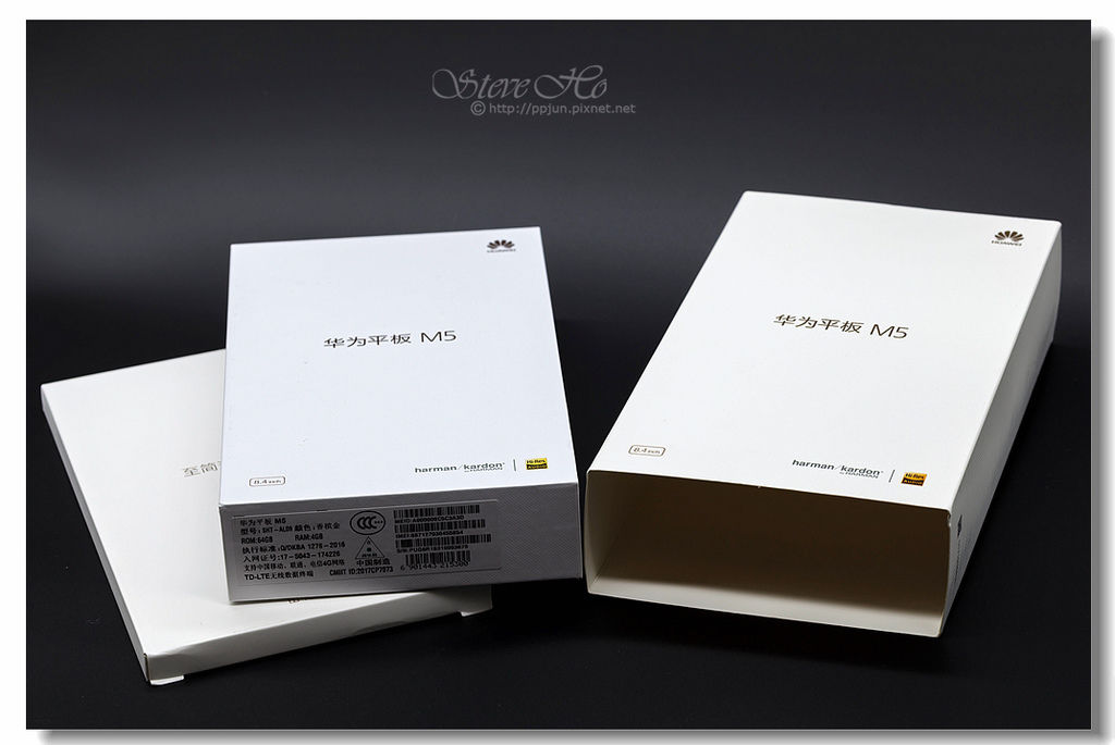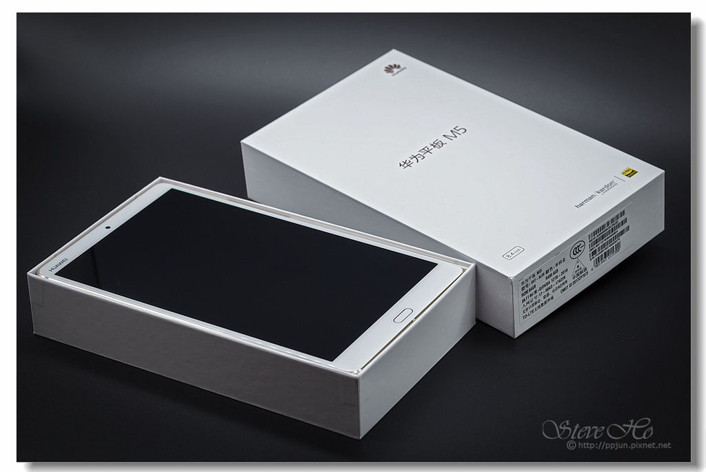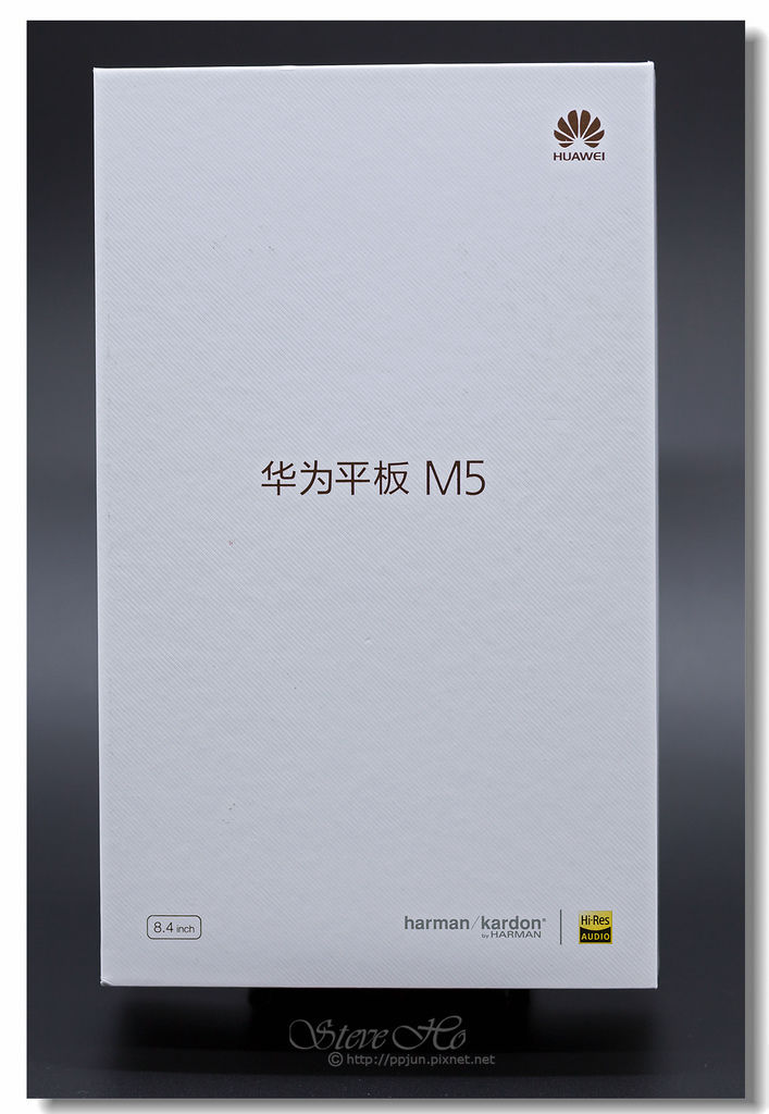 ▲ 正面中間寫著[華為平板M5],右上角是華為的Logo,左下標示平板的尺寸:[8.4inch],右下為主打[harman/kardon]合作調教的強悍音效。
