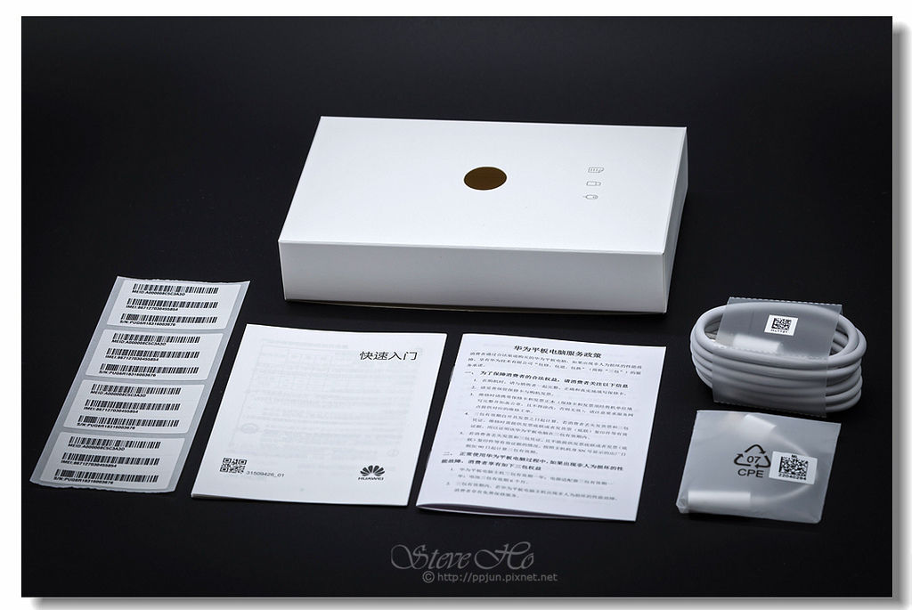 ▲[快速入門]、[華為平板電腦服務政策]2份文件。 [USB Type-C轉3.5mm耳機孔轉接線]及[支援FCP快充的Type-C傳輸線]。