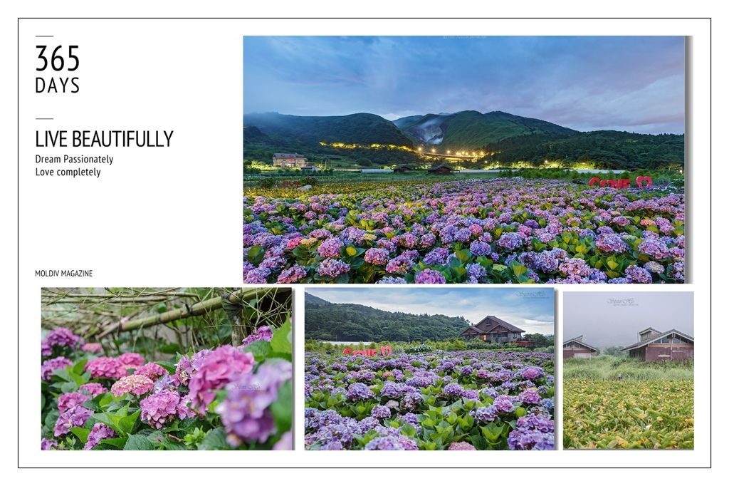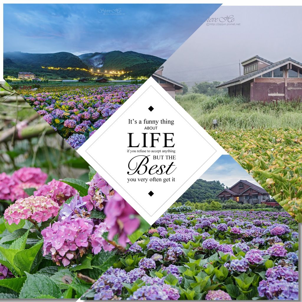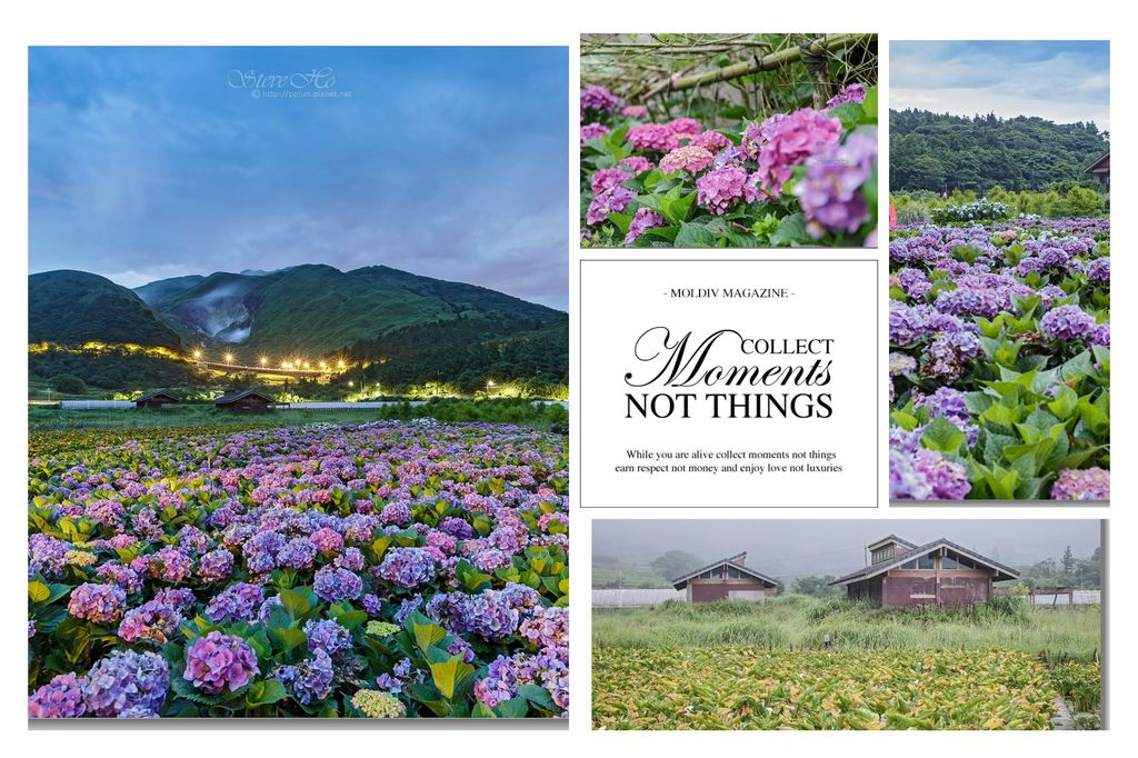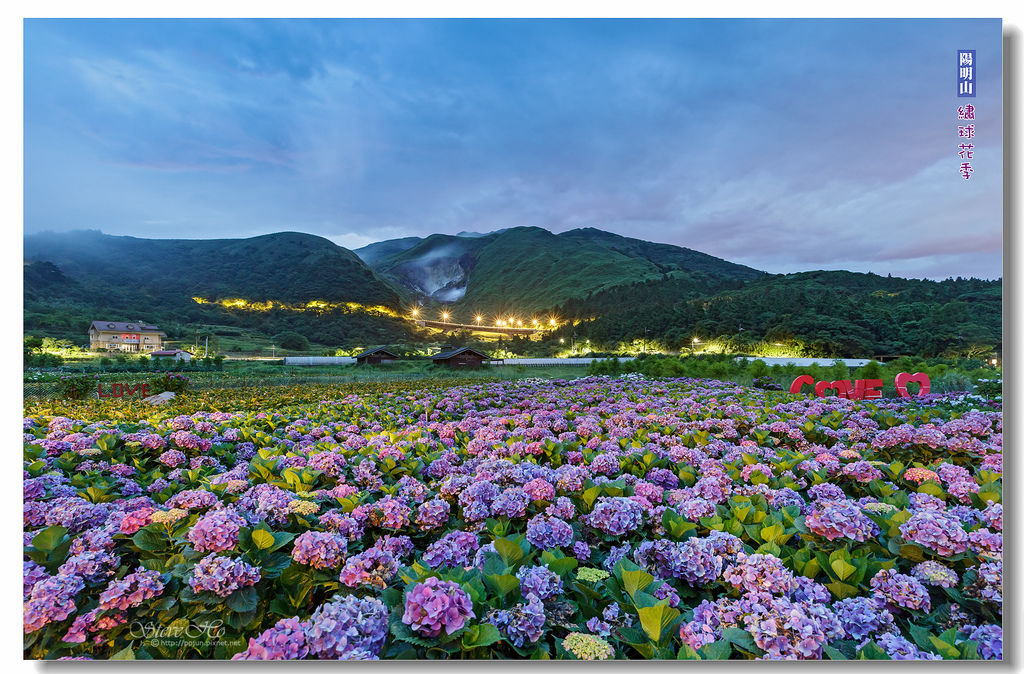 ▲ 當天色漸亮,努力捕捉繡球花海晨曦+小油坑的畫面,吃完早餐,太陽升起後再拍繡球花的特寫。