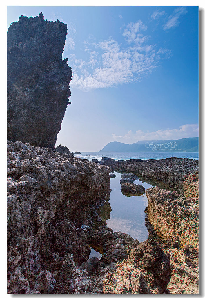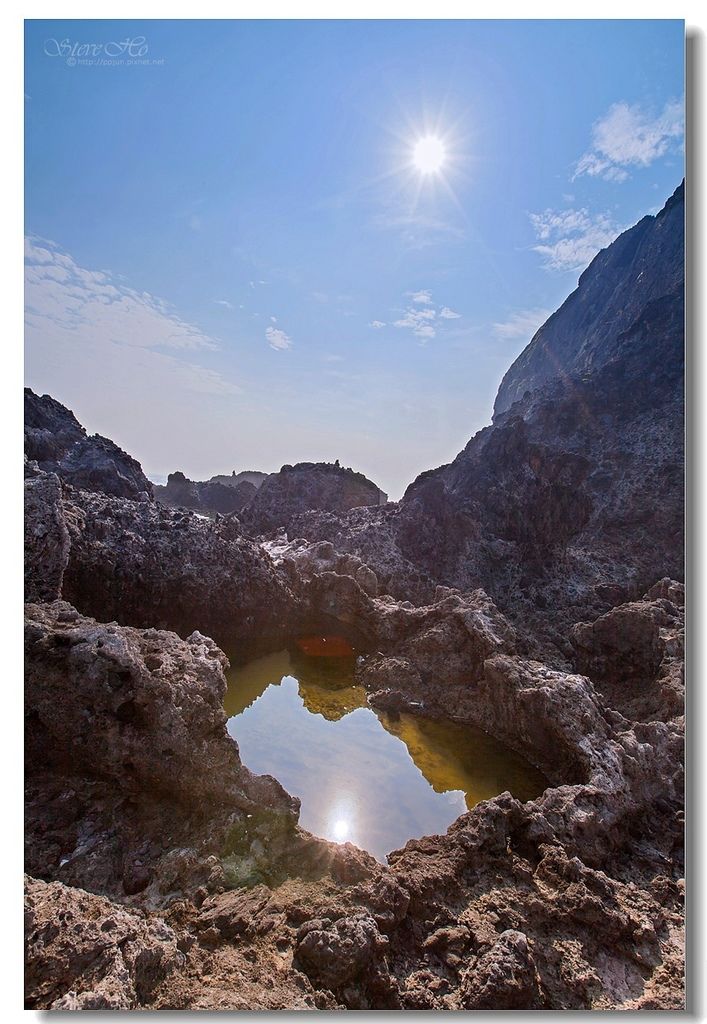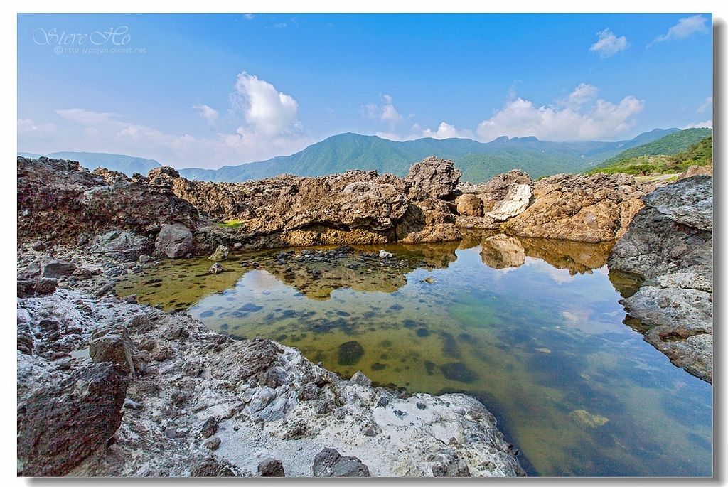 ▲情人洞周遭的岩石將海水圍成一處水潭,水質清澈見底,奇異的海蝕地形與遠方的青山藍天形成一幅特殊的風情畫