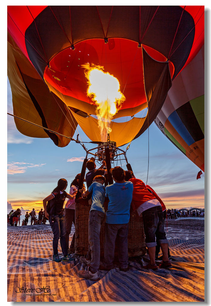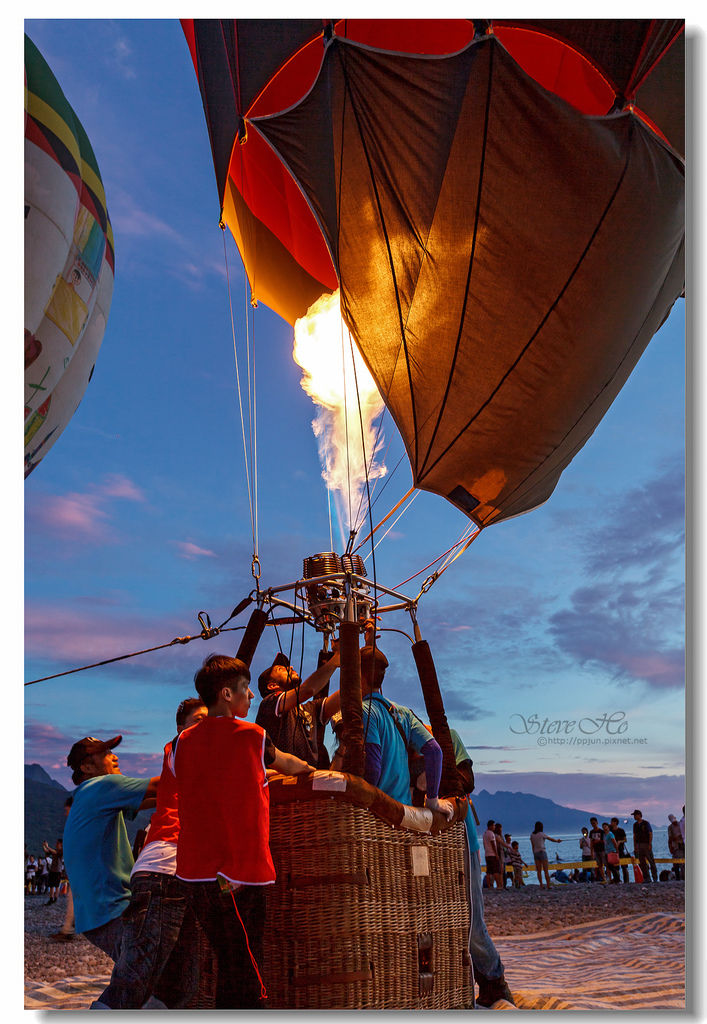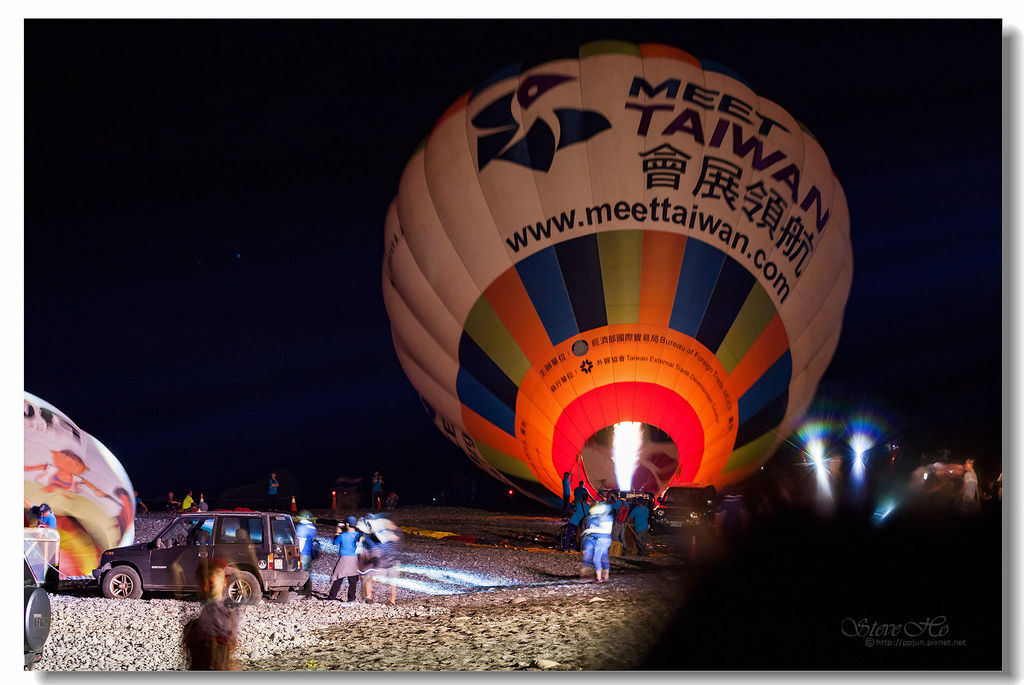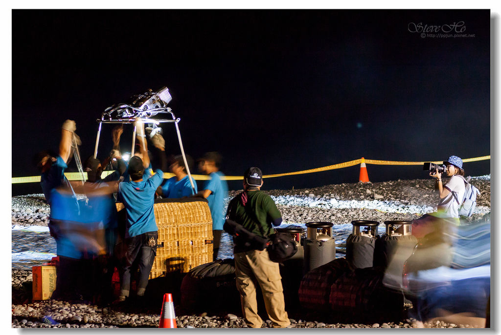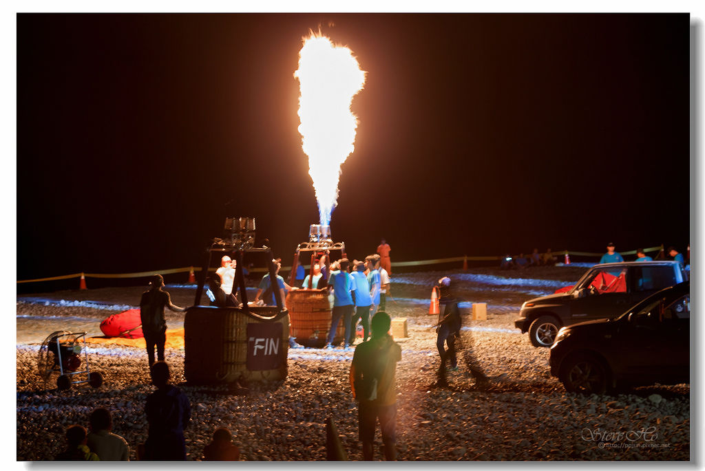 ▲熱氣球開始充氣,全場的人潮都還在靜靜的等候著熱氣球升起,現場只有主持人不斷的說話、介紹,前面也有些表演團體的演出。而熱氣球還不能升起下,只好讓他們噴噴火來暖場一番。
