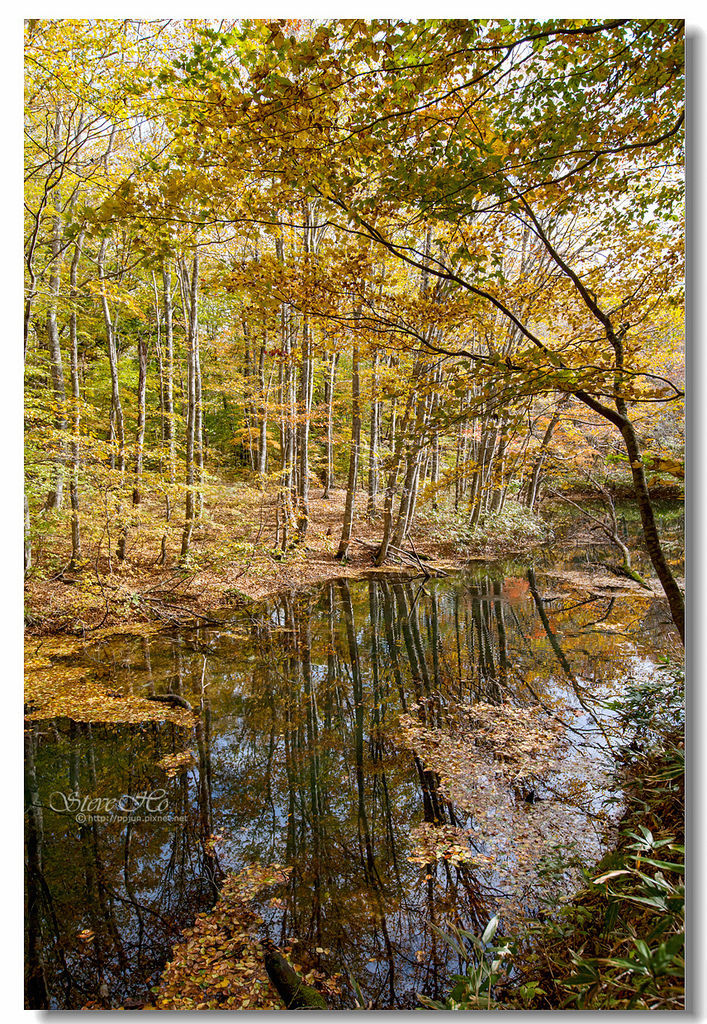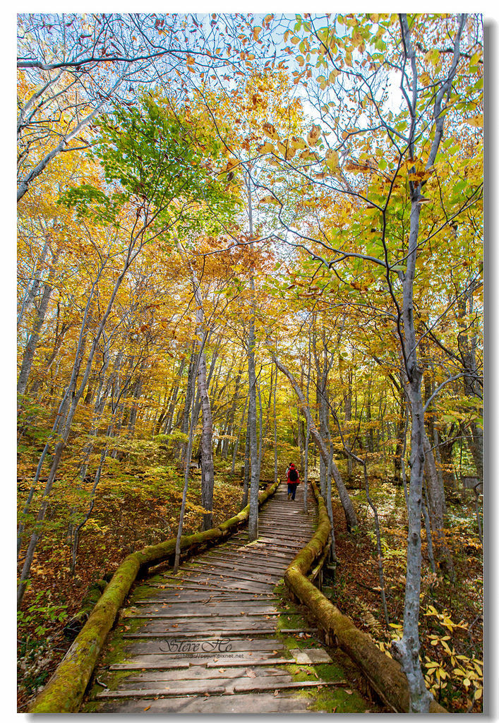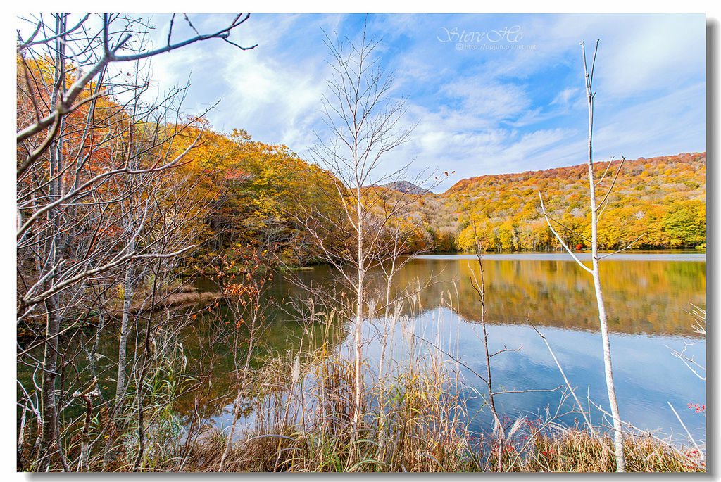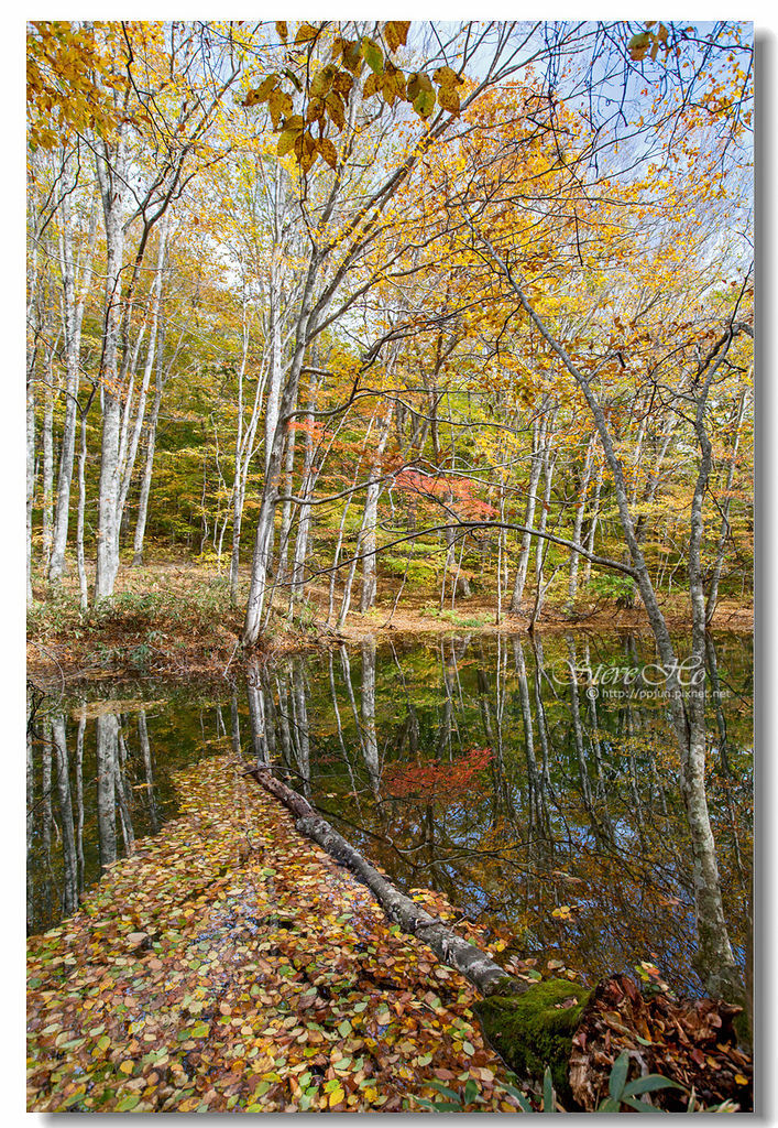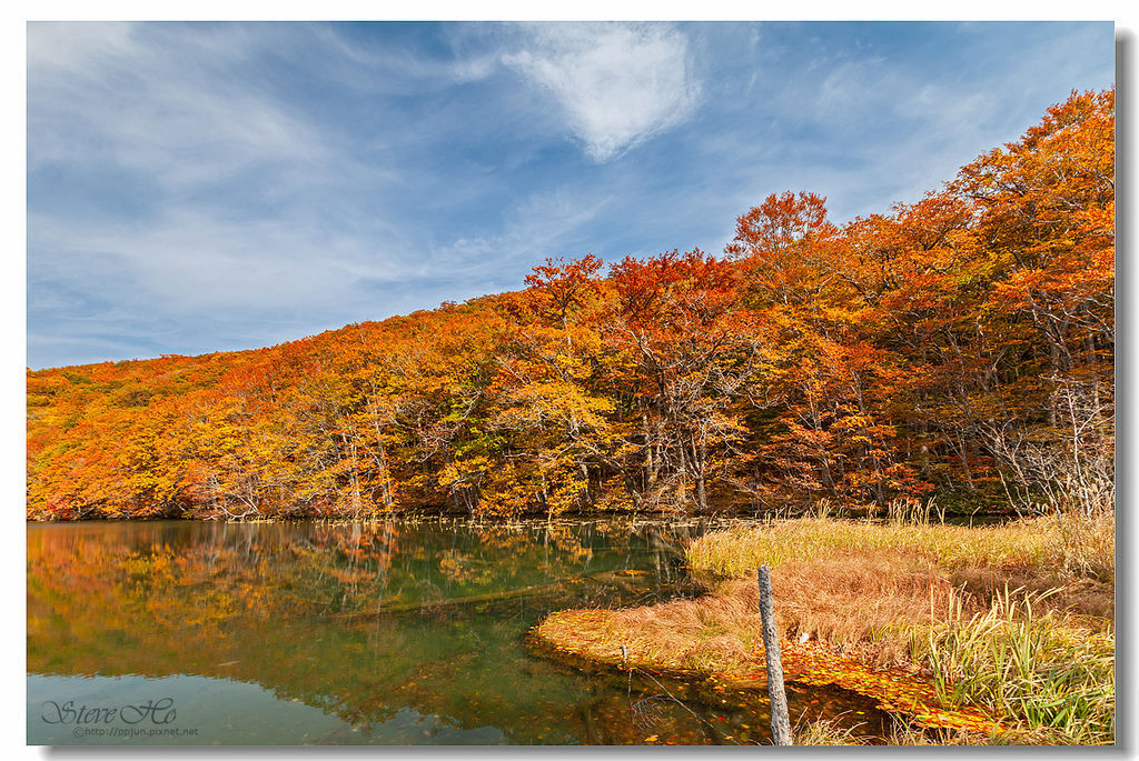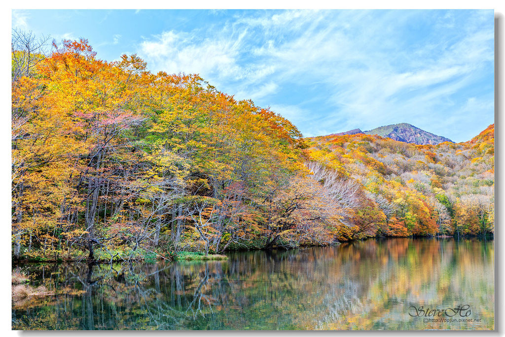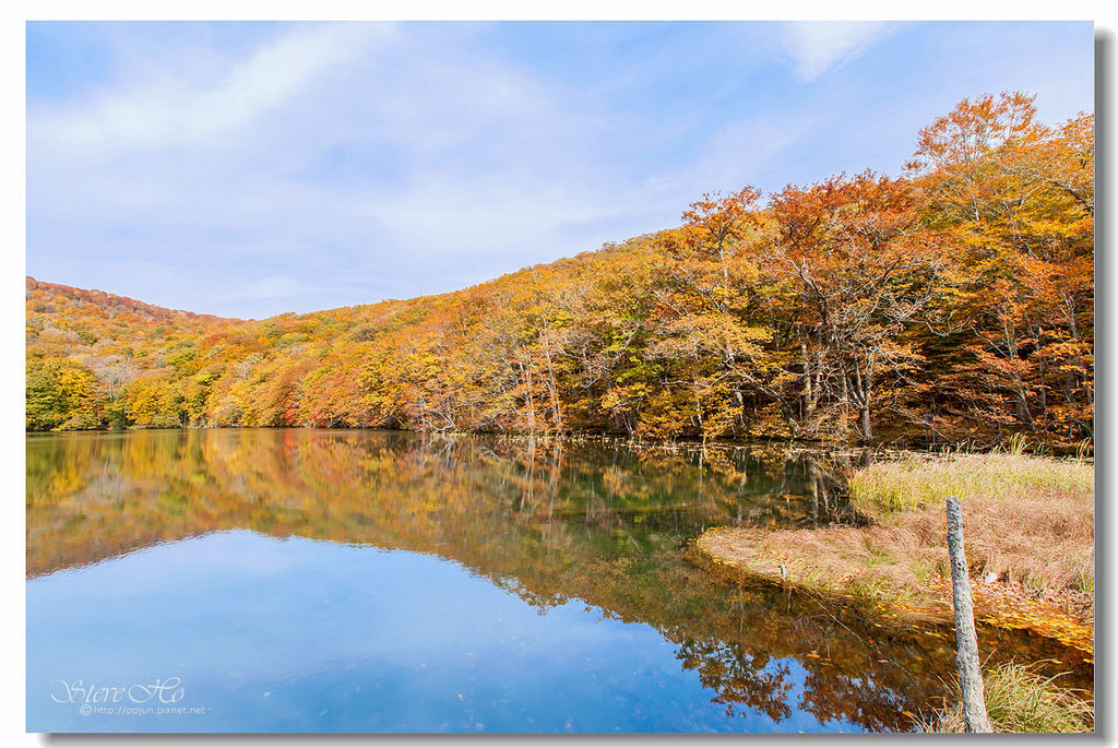 ▲ 要看到蔦沼最著名的「朝燒」,就只能在每年深秋的紅葉季節前往。但即使在楓紅最美的季節到達蔦沼,沒有好天氣或沒掌握好時機,你也是看不到火紅的蔦沼美景的。因為唯有在每天早晨、日出後的10分鐘到半小時間,曙光照射下的蔦沼,才有火紅的、如火燒般的絕景。可惜行程上無法安排在日出前抵達,但眼前的美景已的讓皮皮君心滿意足了!