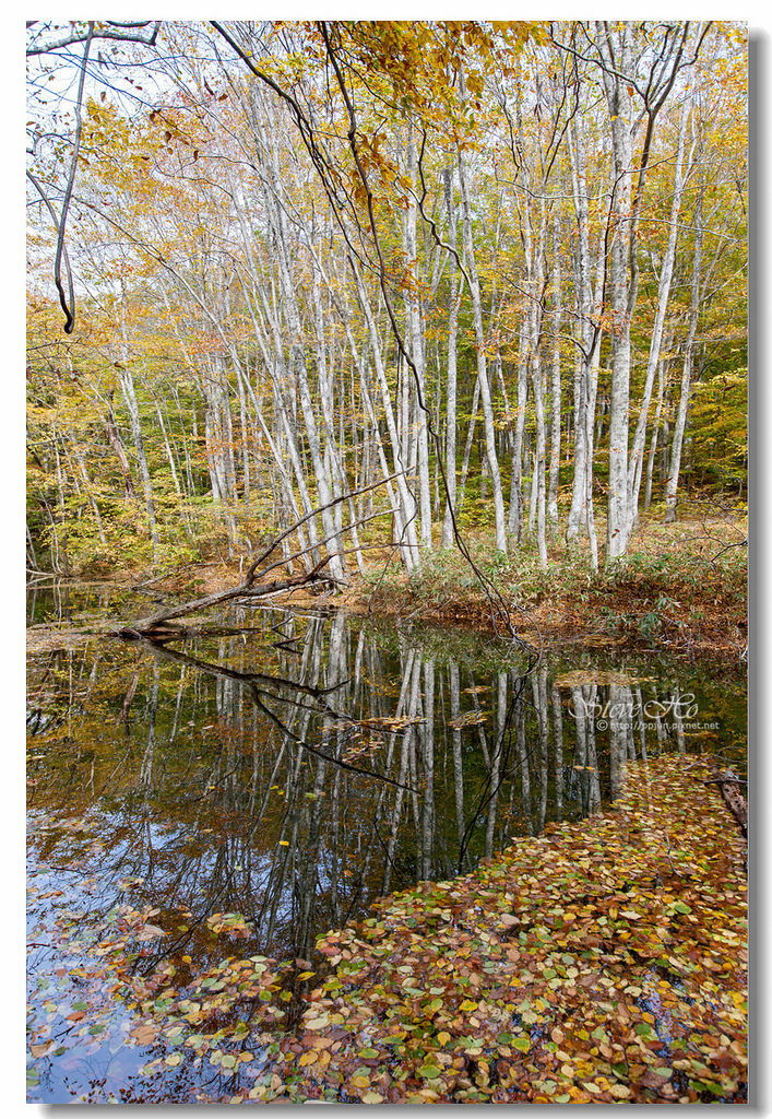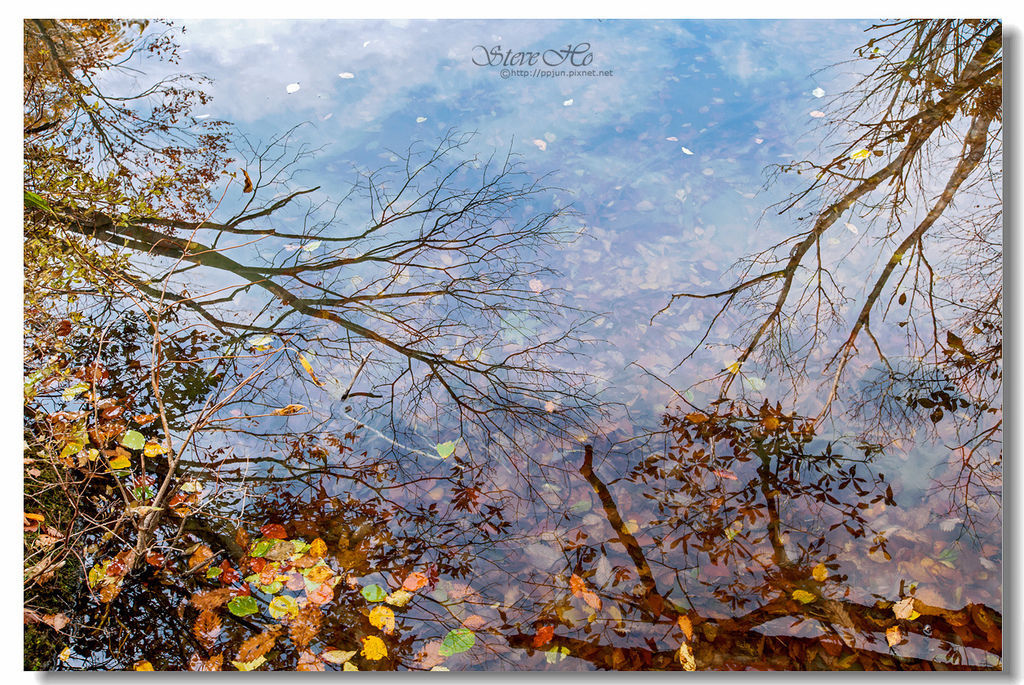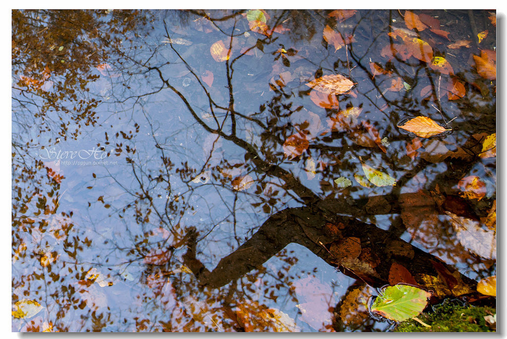 ▲ 平滑如鏡的水面將沼澤旁的楓樹完整映照出來,透過相機,將蔦沼的紅葉美景盡收眼底。