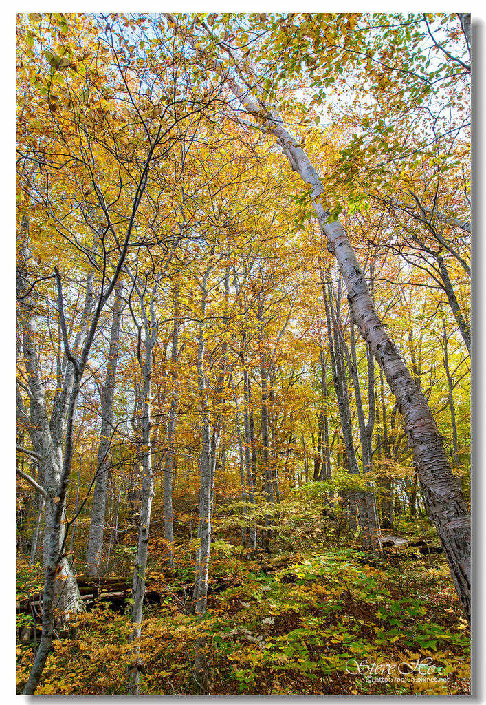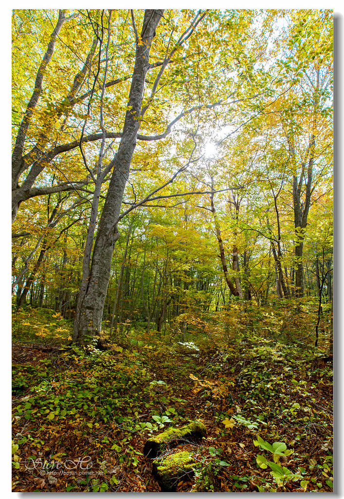 ▲ 循著來時步道返回,在日出後陽光的加持下,整個櫸林金黃耀眼,好不迷人,讓人彷彿走在一條金黃大道上。