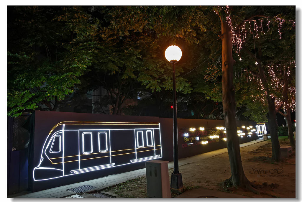 配合捷運環狀線即將開通,在周邊也設置了燈飾裝置「我們的新北列車」;靠近新站路的樹叢中,豎立著一座琉璃城堡,晶瑩剔透的光芒隱約自樹葉中低調又華麗地閃耀著,美麗又動人。