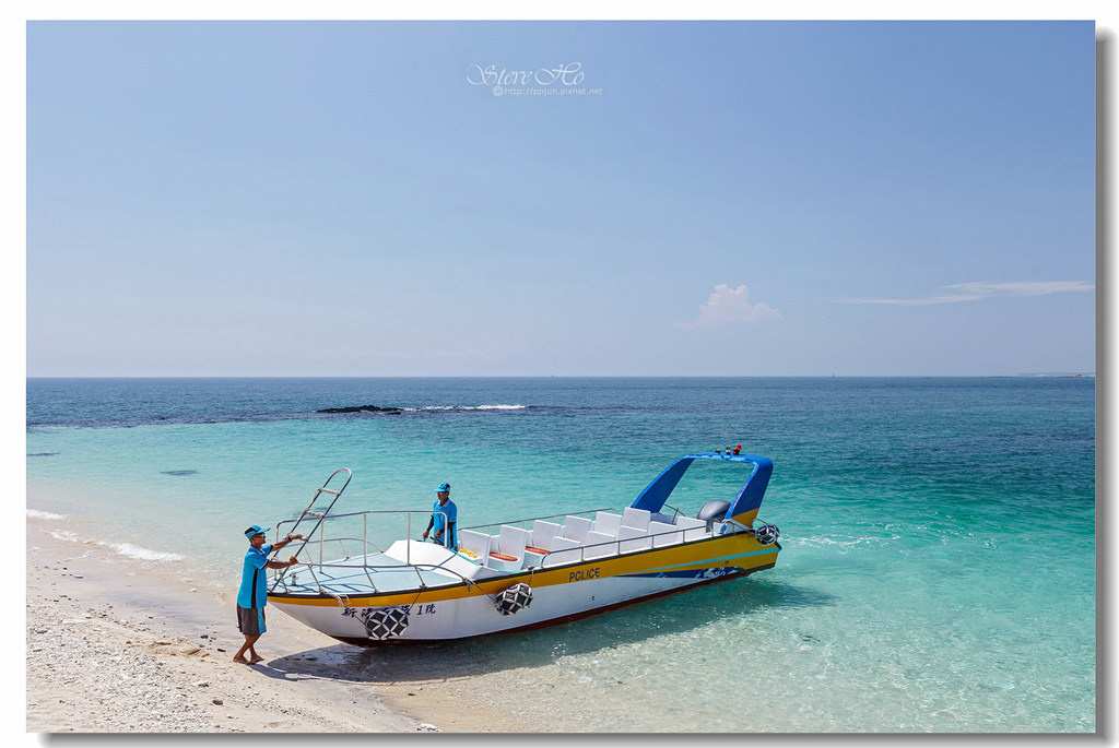 目斗嶼周遭的海域未經任何汙染,沙灘潔白無垃圾,海水也是清澈可見底,讓人不禁想奔向這湛藍海岸。
