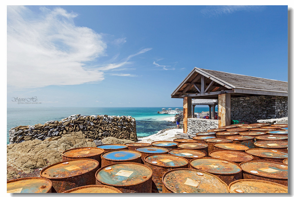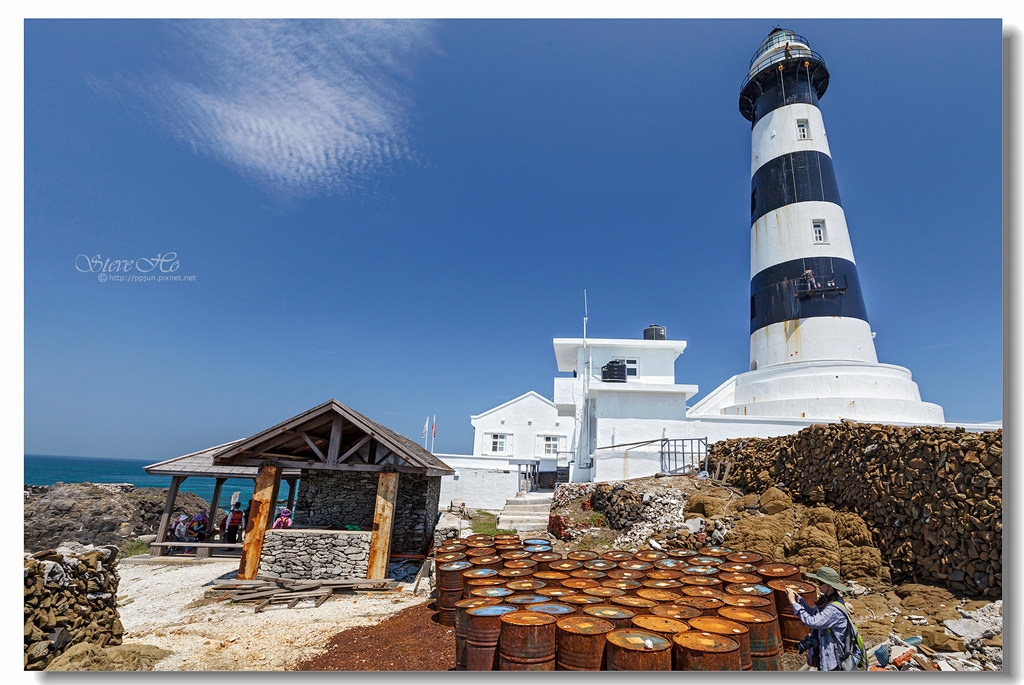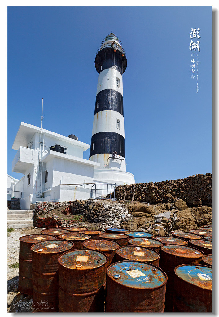 ▲ 目斗嶼燈塔前存放著許多早已生鏽斑駁的儲油桶,與黑白相間的燈塔形成強烈的對比。