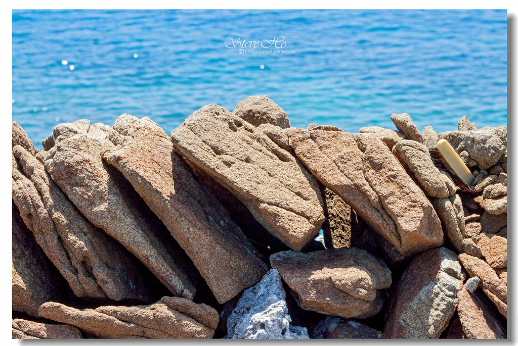 ▲ 目斗嶼島上的潔白沙灘還混和著黑色的玄武岩。澎湖地區多為這種黑色的玄武岩,它是一種地下岩漿從火山中噴出或從地表裂隙中溢出凝結形成的火成岩。