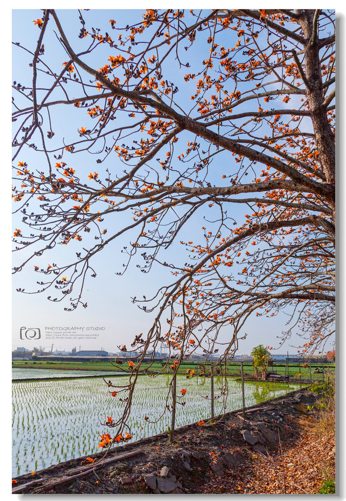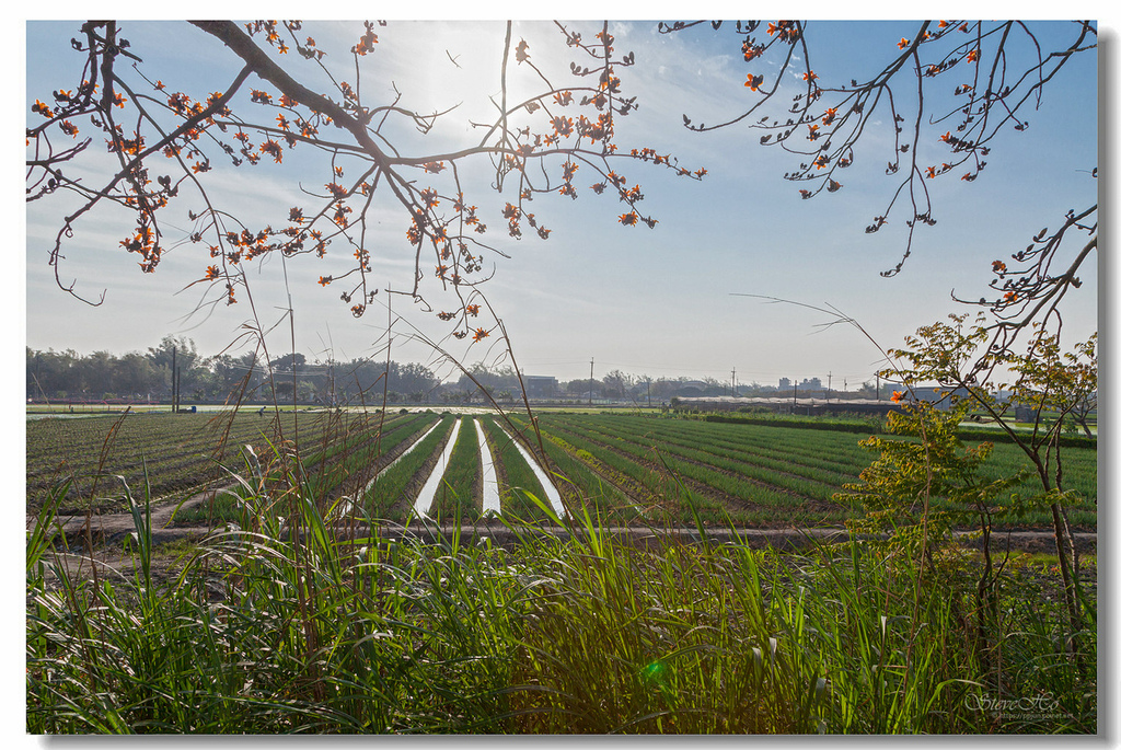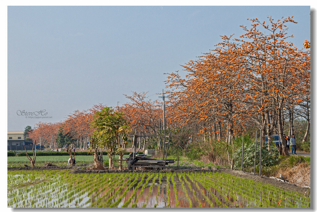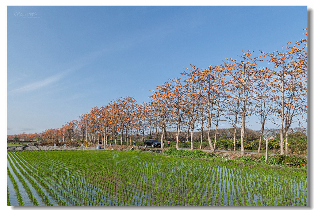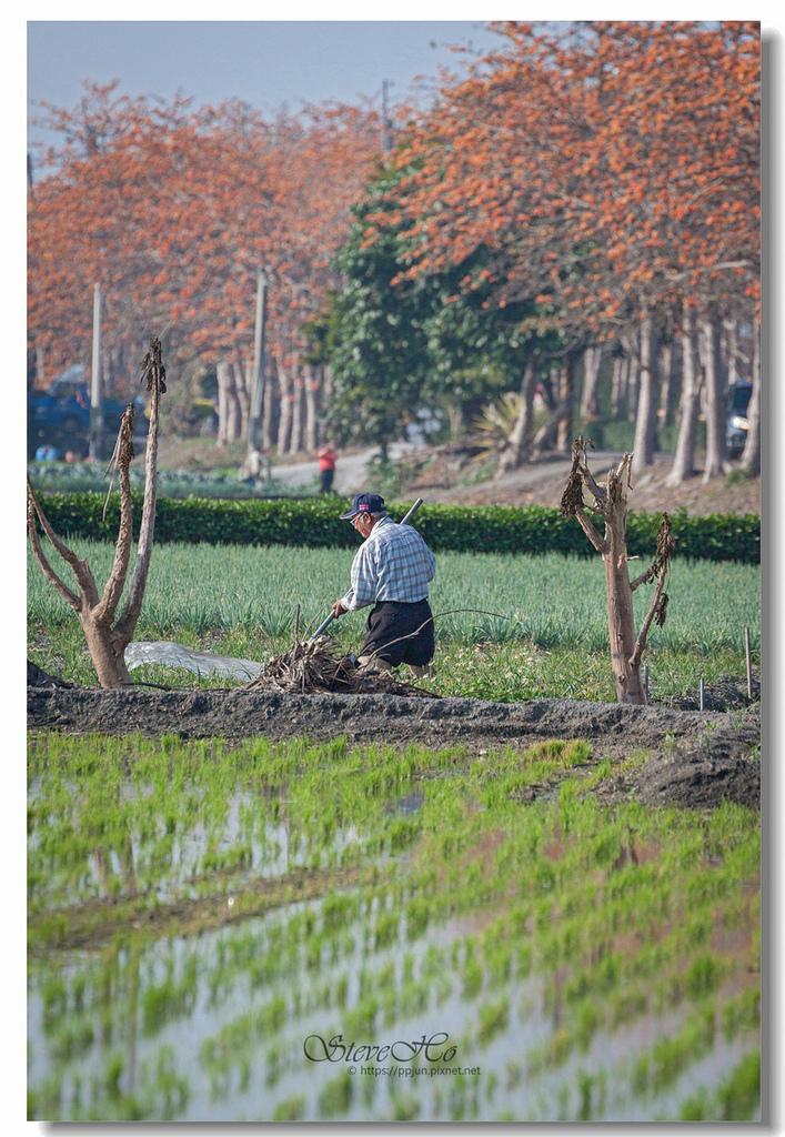▲ 火紅花瓣在藍天白雲輝映下顯得相當顯眼,搭配整齊排列、一旁的碧綠春耕水田,勾勒出愜意閒暇的鄉野情懷