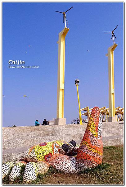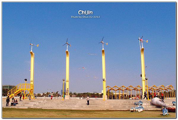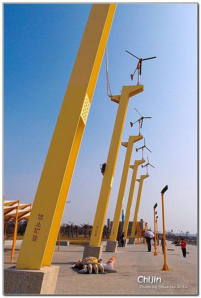 39.[風車公園]最明顯的地標就是黃色的七座三葉式風車,設置七座巨型風車以環保創意訴求,兼具了海岸維護、觀光遊憩、社區休閒及環保風力發電再利用等四大功能