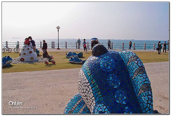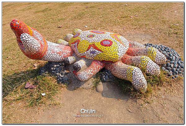 44.一隻由色彩鮮艷馬賽克磚拼貼的螃蟹在旁邊,舉起牠的大鰲,似乎在說:我也要玩!